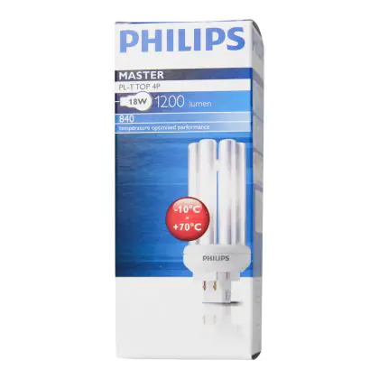 Le Philips PL-T TOP 18W 840 4P (MASTER) sono lampade fluorescenti compatte a basso contenuto di mercurio davvero efficienti. Queste lampade fluorescenti a basso consumo sono un'ottima scelta in termini di rispetto dell'ambiente anche perché hanno una lunga vita. Esse inoltre assicurano performance ottimali di illuminazione per periodi di funzionamento lunghi. L'attacco di queste lampade é del tipo GX24q-2 ed é dotato di 4 pin (perni). La potenza di tali lampade é di 18W. Ricorda: quando sostituisci le tue lampade fluorescenti compatte devi mantenere il medesimo attacco, numero di pin (perni) e potenza delle tue vecchie lampade, altrimenti non sarai in grado di procedere con l'installazione. Questa lampade presentano una temperatura di colore di 4000K, che corrisponde ad una luce bianca fredda. L'indice di resa cromatica é superiore a 80Ra. Le Philips PL-T TOP 18W 840 4P (MASTER)sono classificate con etichetta energetica 'B'. La loro durata media é molto lunga, in media 13000 ore.