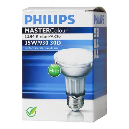 Le Philips CDM-R Elite 35W 930 E27 PAR20 30D (MASTERColour) sono lampade a scarica compatte ad alogenuri metallici in ceramica dotate di riflettore. Sono lampade estremamente efficienti che hanno una potenza pari 35W e presentano una base del tipo E27. La vita media di questi articoli é pari a 15000 ore. L'indice di resa cromatica si colloca nell'intervallo di 90-100Ra, a testimonianza dell'eccellente resa dei colori.